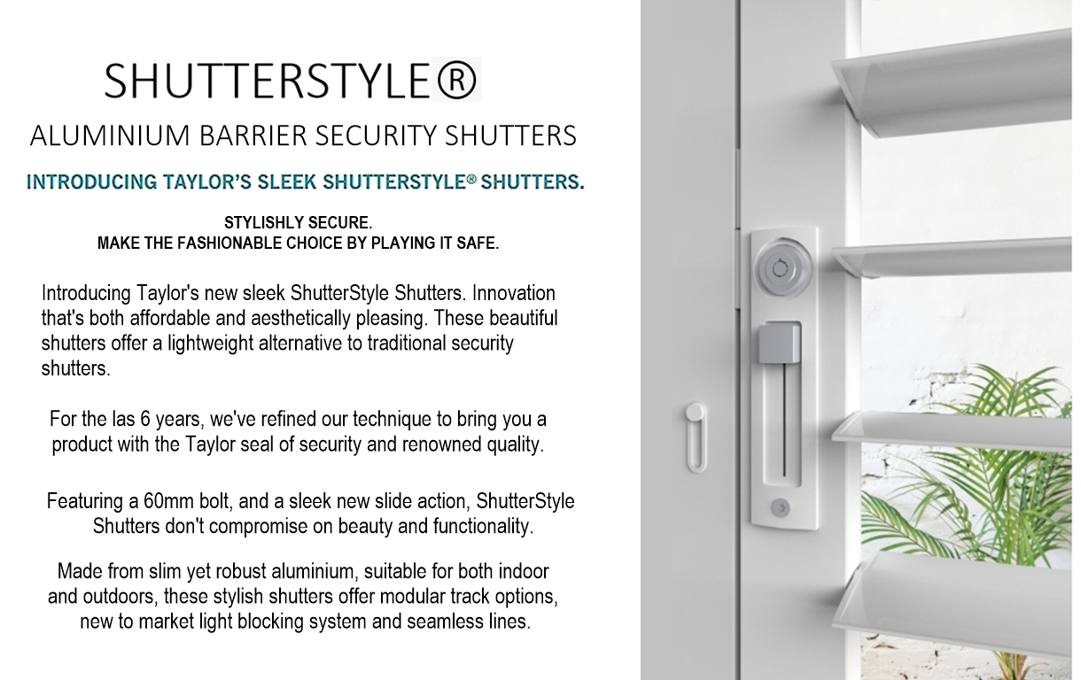 For the style conscious, our new sleek Shutterstye shutters offers premium but affordable style and security. For the last six years, Taylors have refined their technique to bring you a premium security product with the Taylor seal of renowned quality.