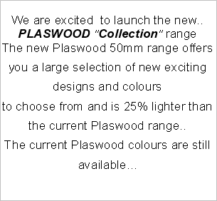 We are proud to launch the new.. PLASWOOD"Collection" range The new Plaswood 50mm range offers you a large selection of new exciting designs and colours to choose from and is 25% lighter than the current Plaswood range..