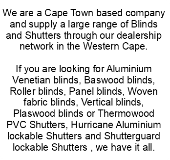 We are a Cape Town based company and supply a large range of Blinds and Shutters in and around the Western Cape. If you are looking for Aluminium Venetian blinds, Baswood blinds, Roller blinds,Vertical blinds, Plaswood blinds or Thermowood PVC Shutters, Hurricane Aluminium lockable Shutters, Shutterguard lockable Shutter and Timber Wood Shutters, we have them all.