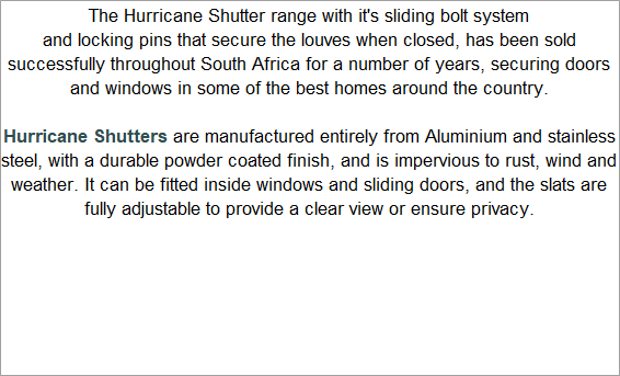 The Hurricane Shutter range with it's sliding bolt system and locking pins that secure the louves when closed, has been sold successfully throughout South Africa for a number of years, securing doors and windows in some of the best homes around the country.
